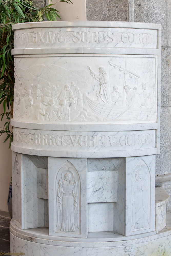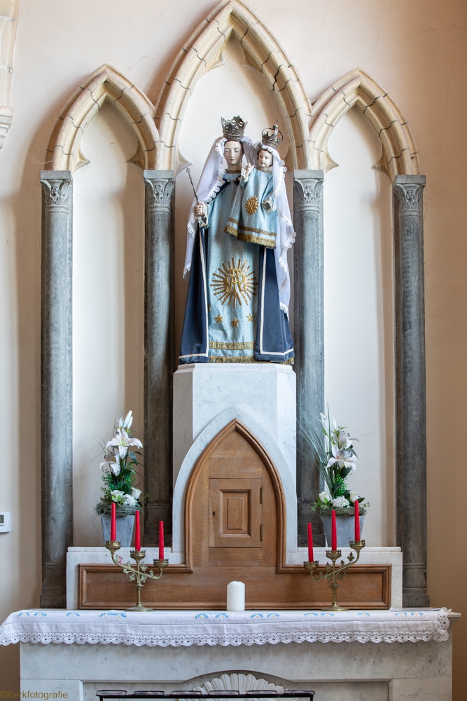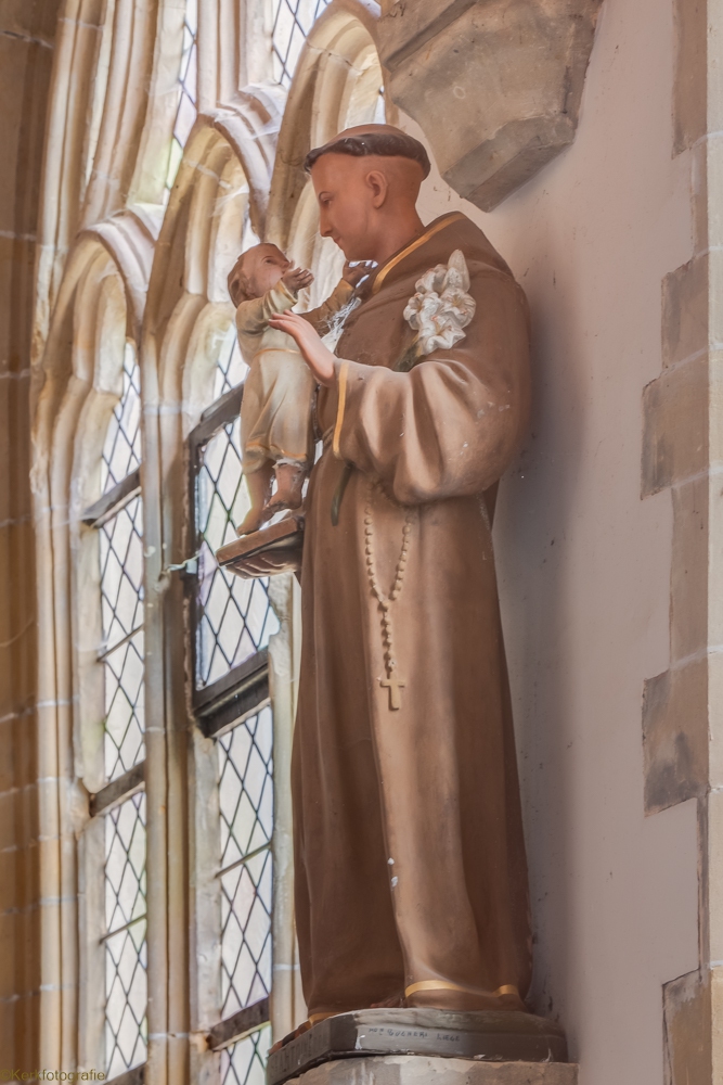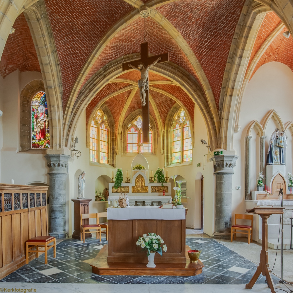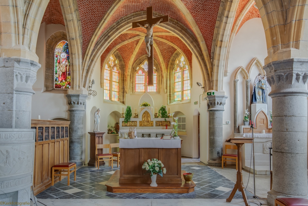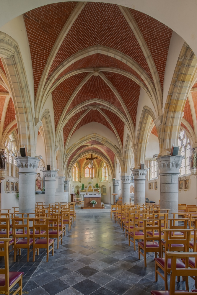 Tussen de eerste twee traveeën is de oorspronkelijke ingang, nu dichtgemetseld, omgebouwd tot een monument voor de Eerste Wereldoorlog: een kalkstenen booglijst op gehoekte stijlen, versterkt door een druipstenen lijst die rust op groteske koppen. Alleen die op het valse dwarsschip is bewaard gebleven.Bedekt met bakstenen gewelven op ribgewelven van tufsteen rustend op consoles. Ronde sluitstenen versierd met rozen en de sleutels van Sint-Pieter. Doopvont gemaakt van kalksteen, met het wapen van Eynatten (begin 17e-18e eeuw).